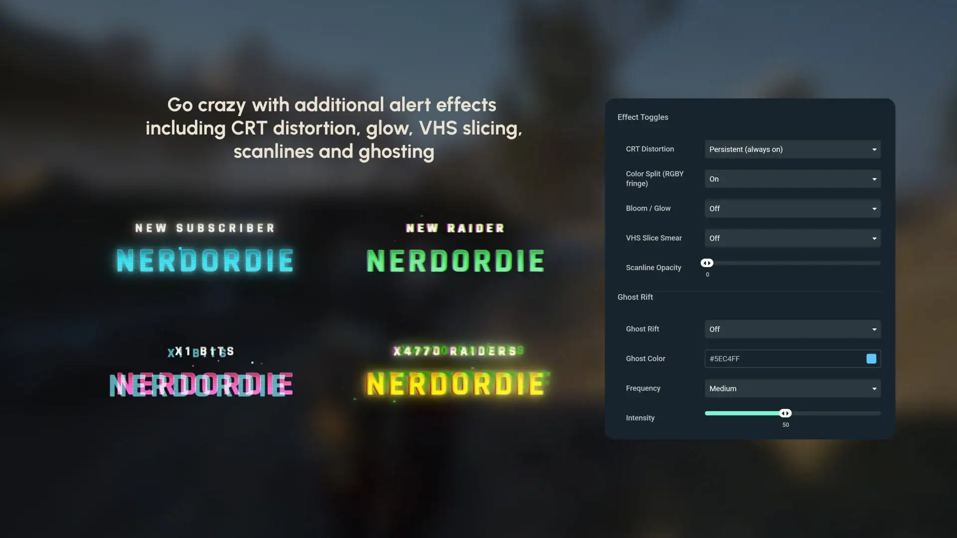 Exodus alerts come loaded with optional post-processing effects you can toggle and tune to taste. Stack them, dial them back, or go full signal corruption.
