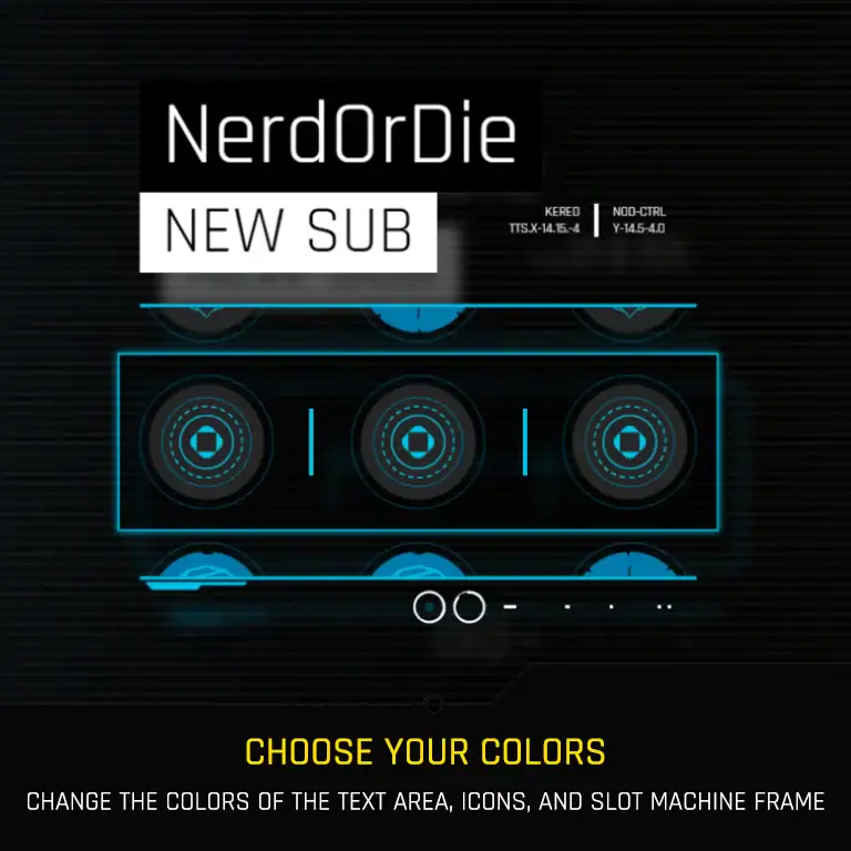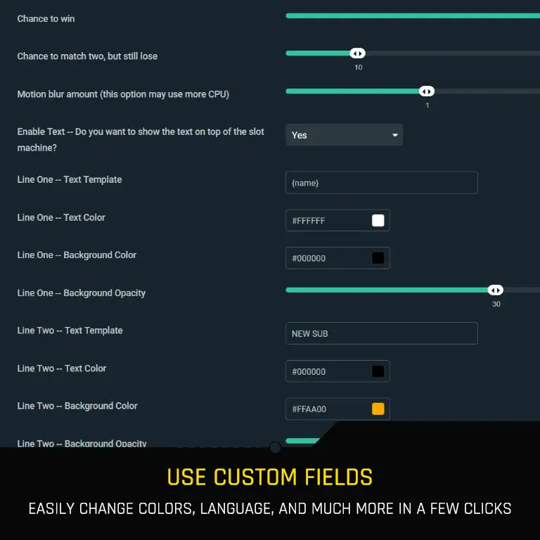 - Customize the colors of the slot machine frame, text areas, and custom icons