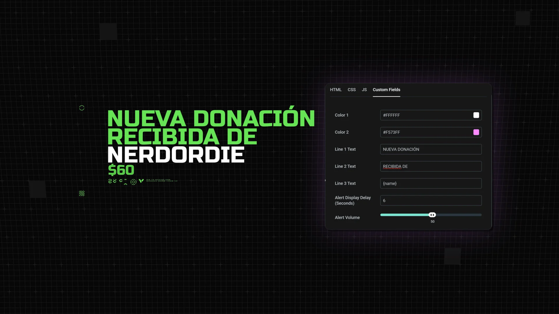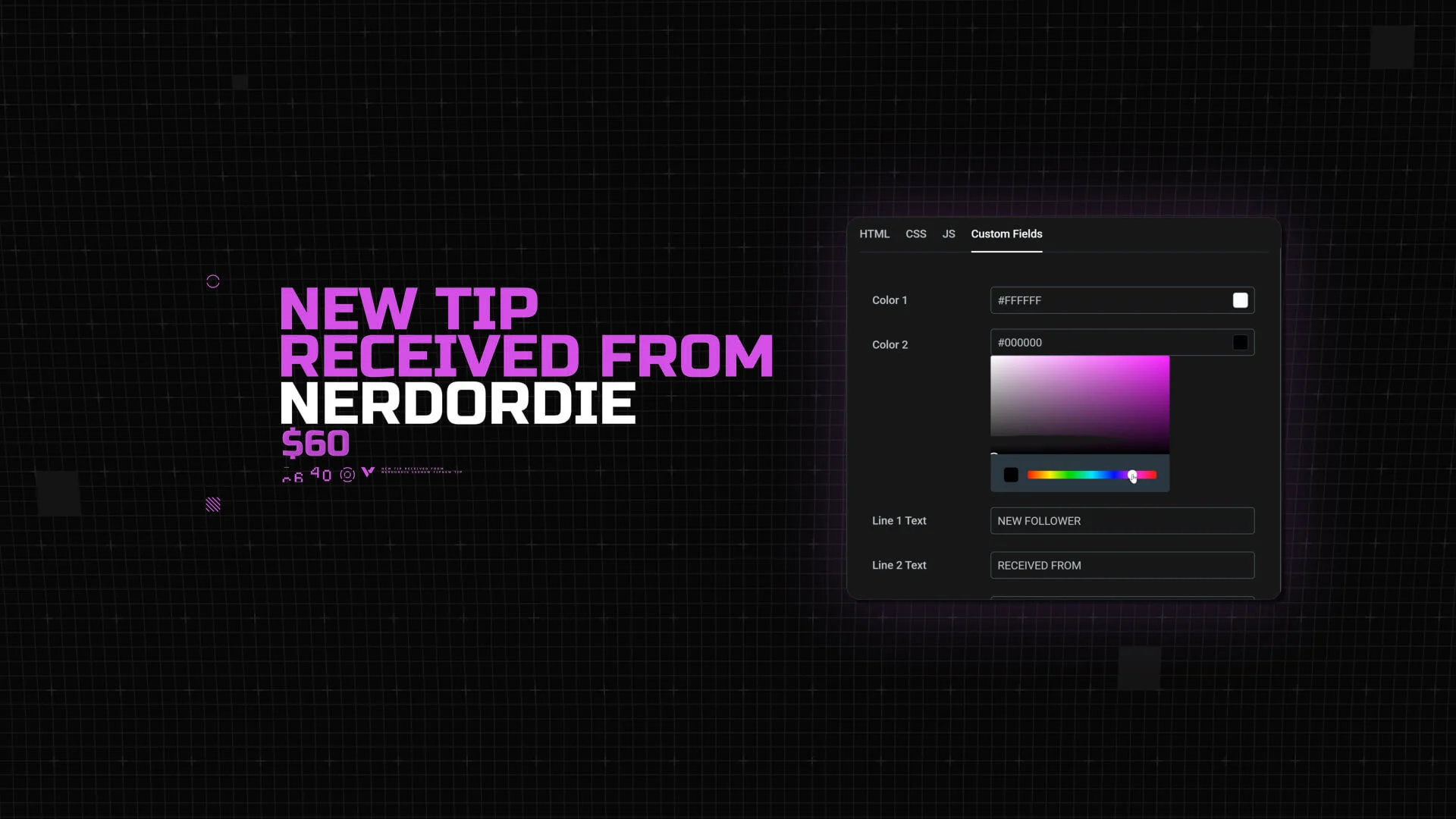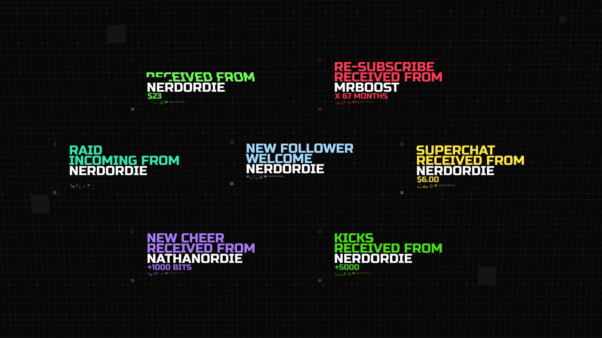 Every alert fires with a quick glitch hit and smooth movement, giving your supporters a moment that stands out without taking over your layout.