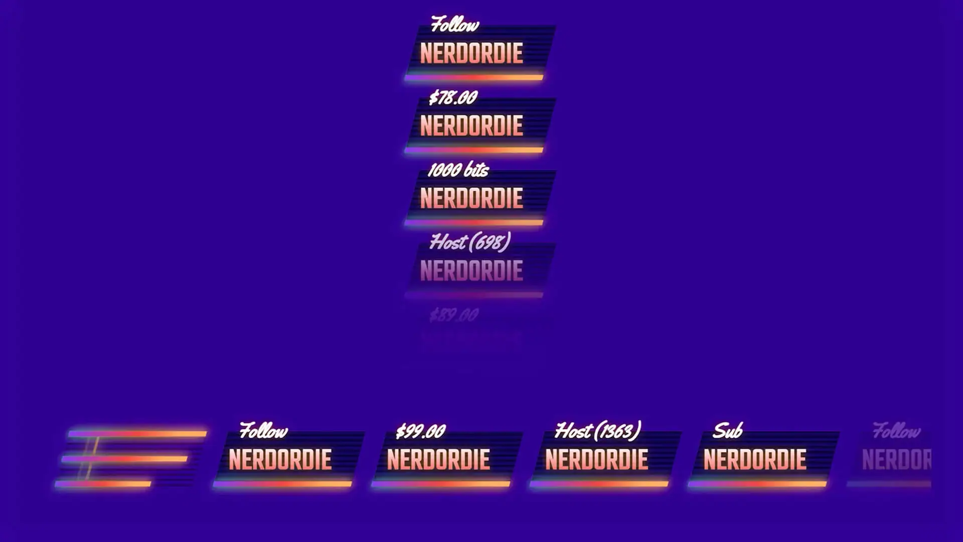 Neon lights and 80s vibes. If you’re a fan of the Retrowave aesthetic, then the Synthwave Event List is perfect. Synthwave Event List can be ran vertically or horizontally to track all your stream events. You can customize the text and control the colors to suit your style.